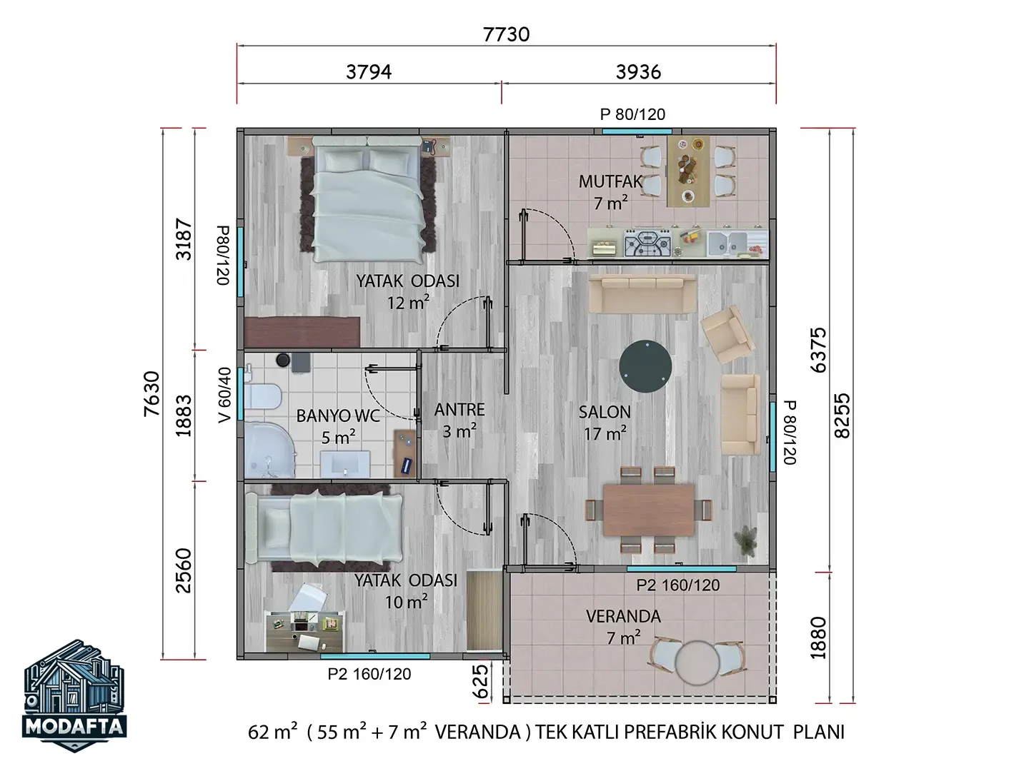 Prefabrik yapılarımız istenilen ölçü ve büyüklükte yapılabilmektedir. Özellikle konutlarda mimar ve mühendislerce hazırlanmış her biri yüksek konfor ve ergonomi içeren hazır tasarımlar müşterilerimizce yoğun talep ve beğeni görmektedir. Metrekarelerine göre 1+1’den başlayarak 3+1’e kadar değişik kullanımlar için çok sayıda planda üretim yapılmaktadır.