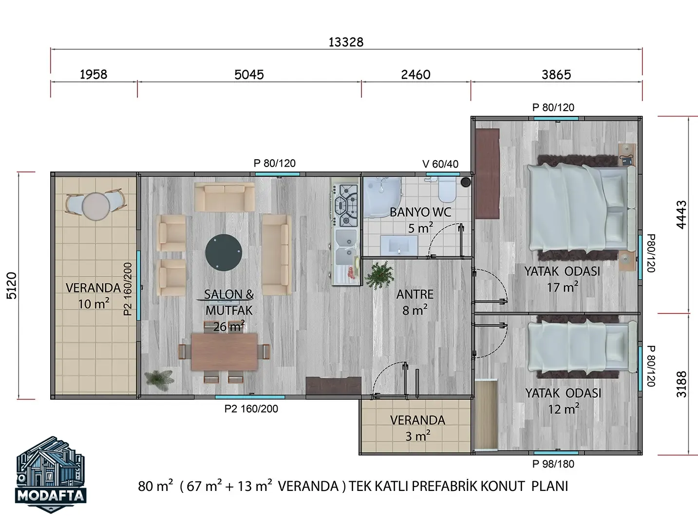 Prefabrik yapılarımız istenilen ölçü ve büyüklükte yapılabilmektedir. Özellikle konutlarda mimar ve mühendislerce hazırlanmış her biri yüksek konfor ve ergonomi içeren hazır tasarımlar müşterilerimizce yoğun talep ve beğeni görmektedir. Metrekarelerine göre 1+1’den başlayarak 3+1’e kadar değişik kullanımlar için çok sayıda planda üretim yapılmaktadır.