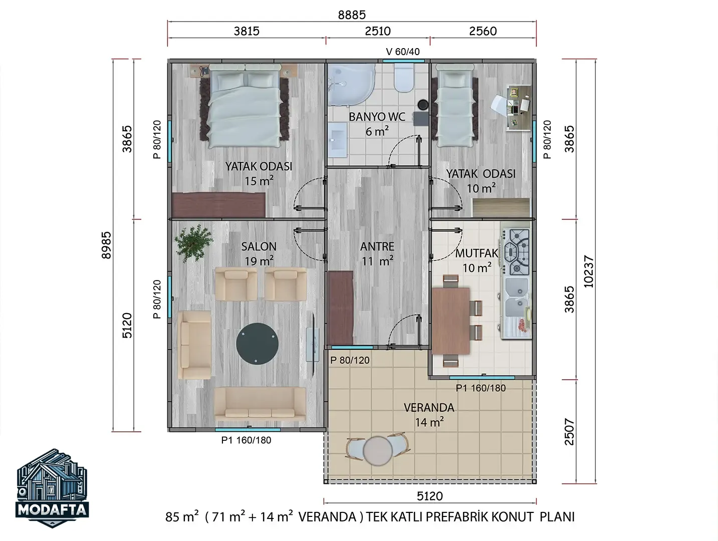 Prefabrik yapılarımız istenilen ölçü ve büyüklükte yapılabilmektedir. Özellikle konutlarda mimar ve mühendislerce hazırlanmış her biri yüksek konfor ve ergonomi içeren hazır tasarımlar müşterilerimizce yoğun talep ve beğeni görmektedir. Metrekarelerine göre 1+1’den başlayarak 3+1’e kadar değişik kullanımlar için çok sayıda planda üretim yapılmaktadır.