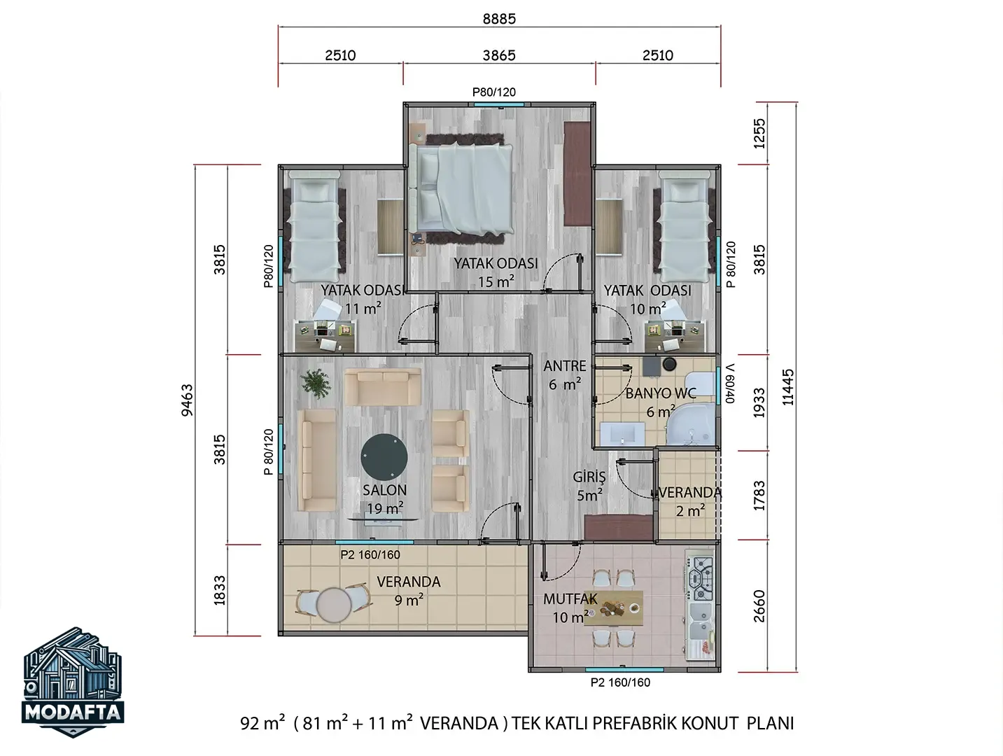 Prefabrik yapılarımız istenilen ölçü ve büyüklükte yapılabilmektedir. Özellikle konutlarda mimar ve mühendislerce hazırlanmış her biri yüksek konfor ve ergonomi içeren hazır tasarımlar müşterilerimizce yoğun talep ve beğeni görmektedir. Metrekarelerine göre 1+1’den başlayarak 3+1’e kadar değişik kullanımlar için çok sayıda planda üretim yapılmaktadır.