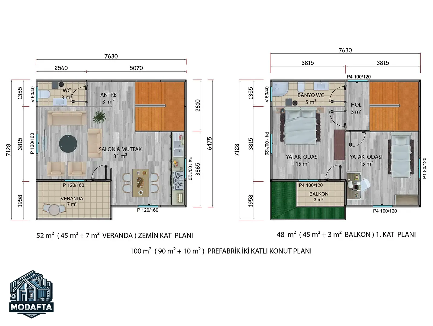 Prefabrik yapılarımız istenilen ölçü ve büyüklükte yapılabilmektedir. Özellikle konutlarda mimar ve mühendislerce hazırlanmış her biri yüksek konfor ve ergonomi içeren hazır tasarımlar müşterilerimizce yoğun talep ve beğeni görmektedir. Metrekarelerine göre 1+1’den başlayarak 3+1’e kadar değişik kullanımlar için çok sayıda planda üretim yapılmaktadır.