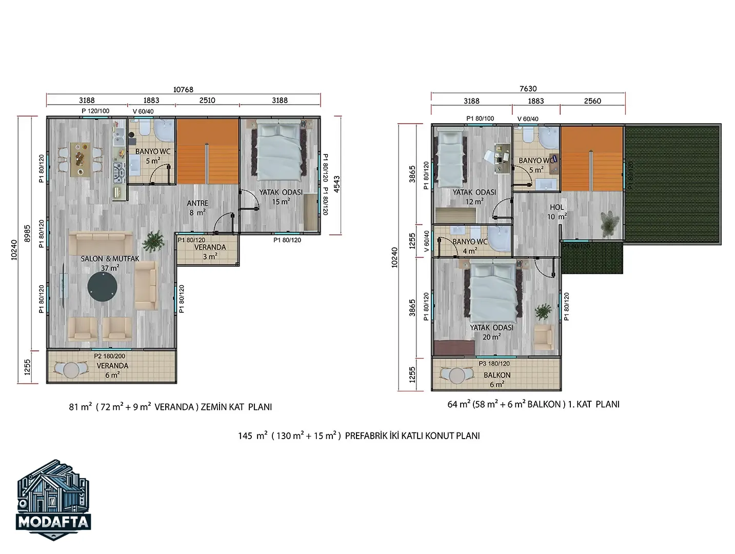 Prefabrik yapılarımız istenilen ölçü ve büyüklükte yapılabilmektedir. Özellikle konutlarda mimar ve mühendislerce hazırlanmış her biri yüksek konfor ve ergonomi içeren hazır tasarımlar müşterilerimizce yoğun talep ve beğeni görmektedir. Metrekarelerine göre 1+1’den başlayarak 3+1’e kadar değişik kullanımlar için çok sayıda planda üretim yapılmaktadır.