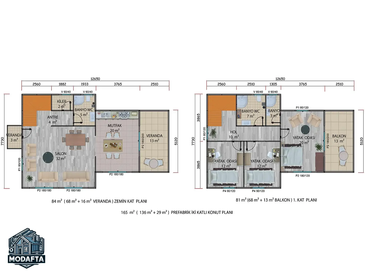 Prefabrik yapılarımız istenilen ölçü ve büyüklükte yapılabilmektedir. Özellikle konutlarda mimar ve mühendislerce hazırlanmış her biri yüksek konfor ve ergonomi içeren hazır tasarımlar müşterilerimizce yoğun talep ve beğeni görmektedir. Metrekarelerine göre 1+1’den başlayarak 3+1’e kadar değişik kullanımlar için çok sayıda planda üretim yapılmaktadır.
