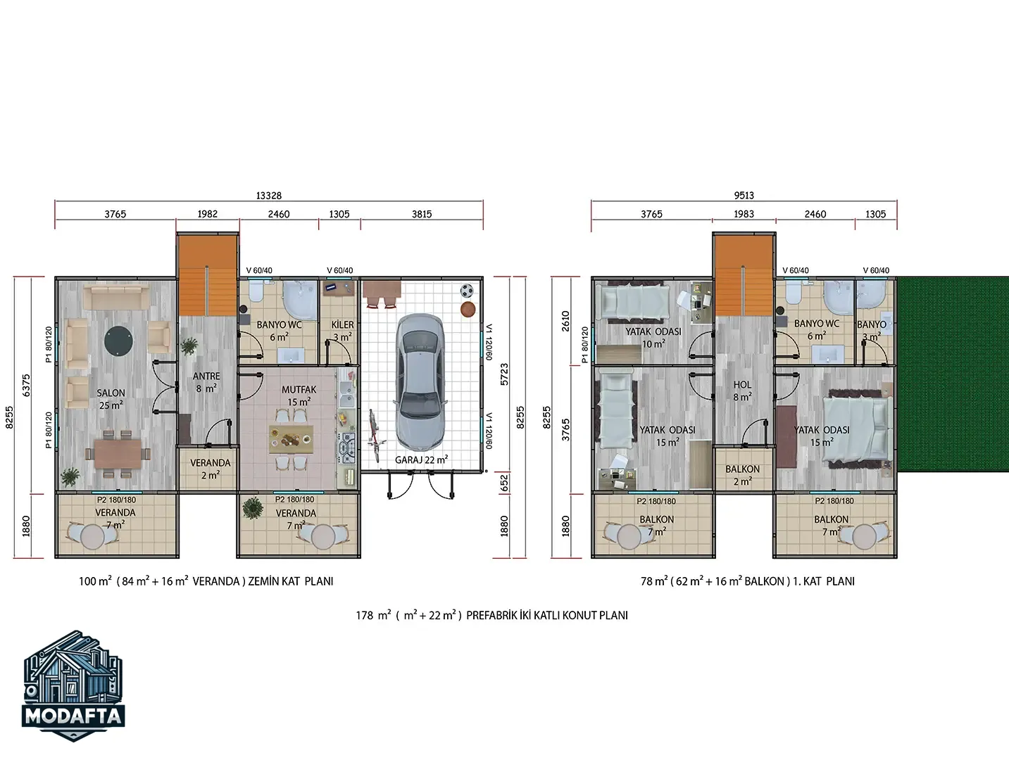 Prefabrik yapılarımız istenilen ölçü ve büyüklükte yapılabilmektedir. Özellikle konutlarda mimar ve mühendislerce hazırlanmış her biri yüksek konfor ve ergonomi içeren hazır tasarımlar müşterilerimizce yoğun talep ve beğeni görmektedir. Metrekarelerine göre 1+1’den başlayarak 3+1’e kadar değişik kullanımlar için çok sayıda planda üretim yapılmaktadır.