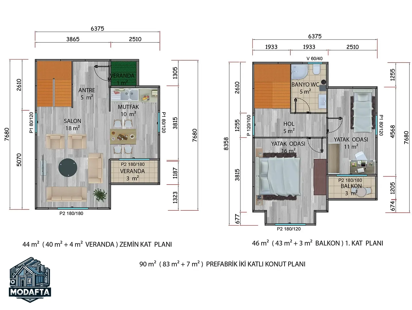 Prefabrik yapılarımız istenilen ölçü ve büyüklükte yapılabilmektedir. Özellikle konutlarda mimar ve mühendislerce hazırlanmış her biri yüksek konfor ve ergonomi içeren hazır tasarımlar müşterilerimizce yoğun talep ve beğeni görmektedir. Metrekarelerine göre 1+1’den başlayarak 3+1’e kadar değişik kullanımlar için çok sayıda planda üretim yapılmaktadır.