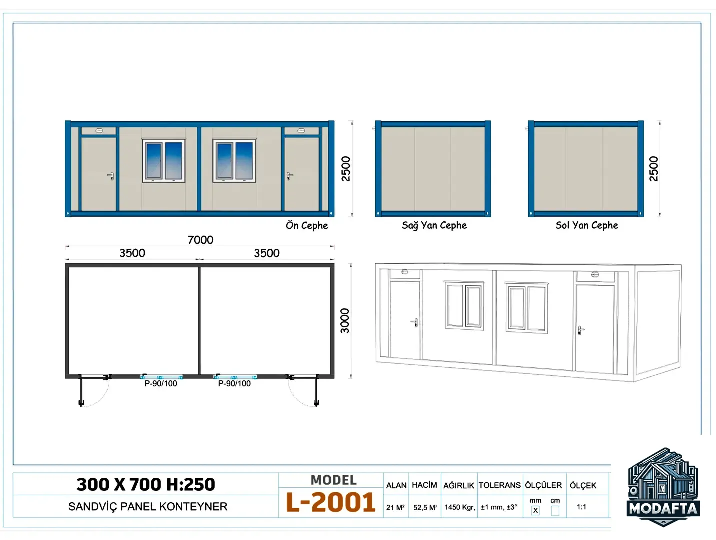 Müşterilerimizin ihtiyaçları ve uluslararası taşıma standartları dikkate alınarak tespit edilen çok sayıda model ve ölçü standartlarından biri tam da sizin için hazırlanmıştır. Klasik demonte konteyner üretim standardı 230x595 iken bizde 3x7 konteyneri tam demonte üretim gerçekleştiren bir firmayız. Bu durum benzerlerine göre 7 metrekare daha geniş imkanıyla üstün kılmaktadır.