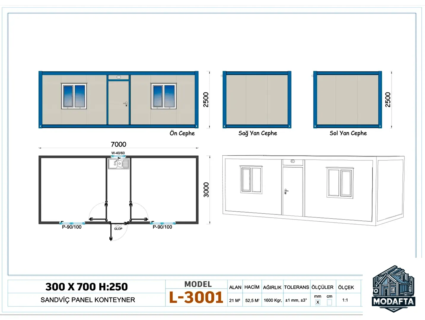 Müşterilerimizin ihtiyaçları ve uluslararası taşıma standartları dikkate alınarak tespit edilen çok sayıda model ve ölçü standartlarından biri tam da sizin için hazırlanmıştır. Klasik demonte konteyner üretim standardı 230x595 iken bizde 3x7 konteyneri tam demonte üretim gerçekleştiren bir firmayız. Bu durum benzerlerine göre 7 metrekare daha geniş imkanıyla üstün kılmaktadır.