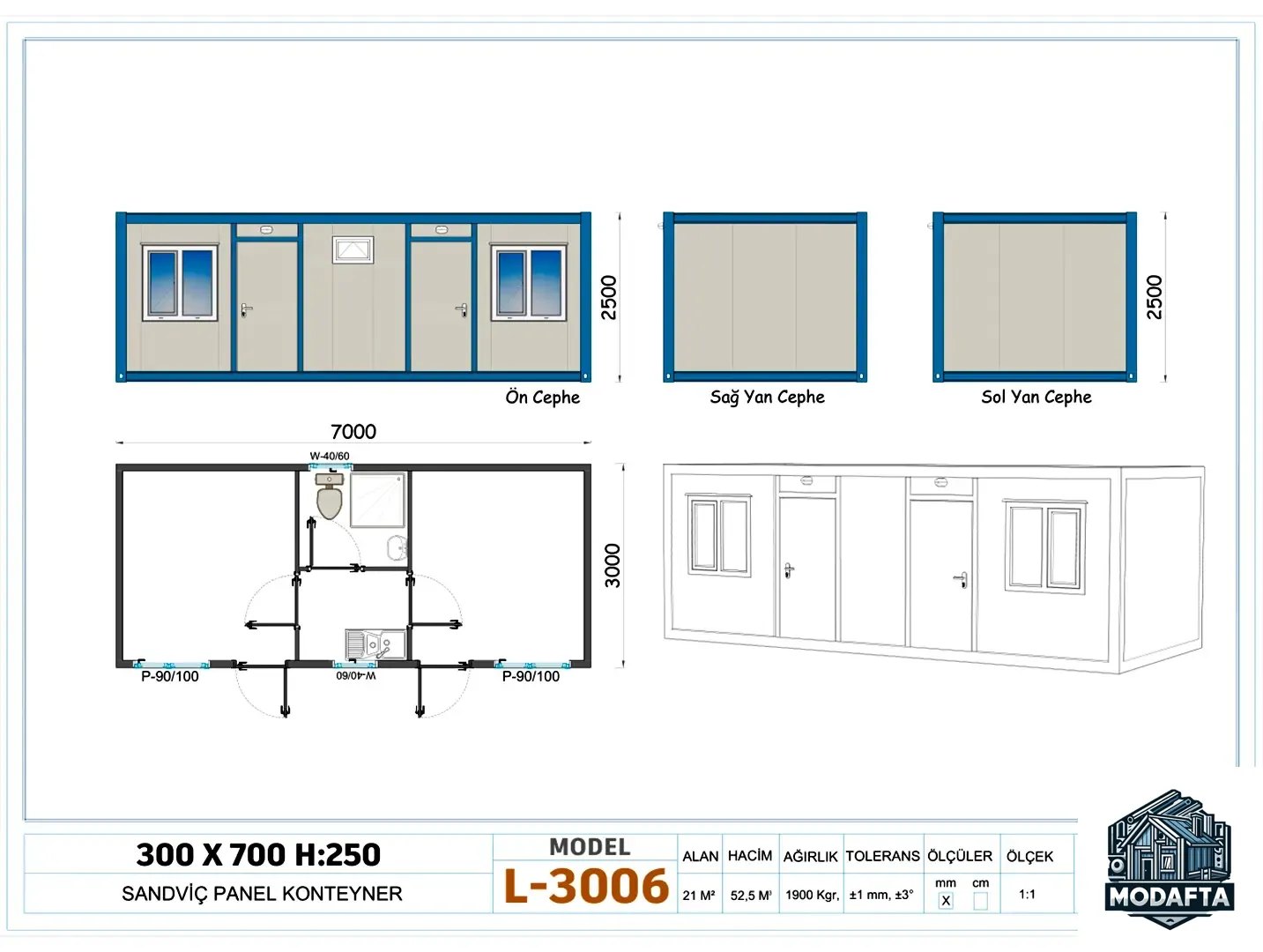 Müşterilerimizin ihtiyaçları ve uluslararası taşıma standartları dikkate alınarak tespit edilen çok sayıda model ve ölçü standartlarından biri tam da sizin için hazırlanmıştır. Klasik demonte konteyner üretim standardı 230x595 iken bizde 3x7 konteyneri tam demonte üretim gerçekleştiren bir firmayız. Bu durum benzerlerine göre 7 metrekare daha geniş imkanıyla üstün kılmaktadır.